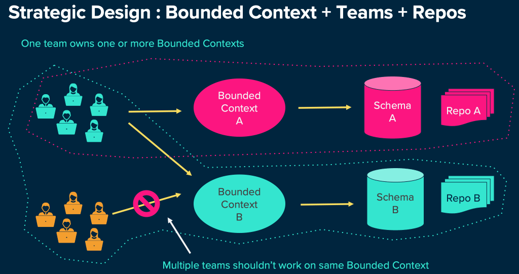 โดยที่ทีมนี้สามารถทำงานกับ Bounded context อื่นได้ แต่ไม่ควรให้หลายทีมทำงานบน Bounded Context เดียวกัน เพราะจะส่งปัญหาเรื่องความเข้าใจกับ Bounded Context ที่แตกต่างกันได้