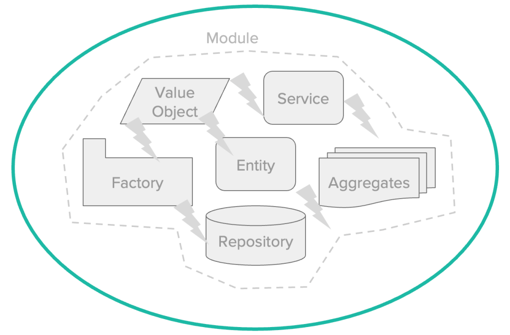 - Modules เป็นการ grouping ของสิ่งต่างๆ ใน Bounded context ที่อาจจะมีหลาย module โดยไม่สัมพันธ์กัน
