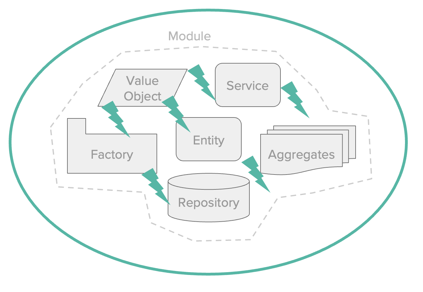 - Modules เป็นการ grouping ของสิ่งต่างๆ ใน Bounded context ที่อาจจะมีหลาย module โดยไม่สัมพันธ์กัน