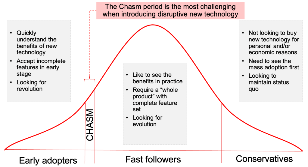 แต่การที่เราจะเห็นการใช้ technology นี้ใน scale ที่ใหญ่ขึ้น และใช้งานต่อเนื่อง หรือไปต่อกับ technlogy นั้นอาจจะต้องใช้เวลา และเจออุปสรรคที่ค่อนข้างเยอะ (challenges) เพราะเรามักจะมองว่าการข้ามจาก early adopters ไป fast followers จะเป็น journey ที่ต่อเนื่องเช่น phase1 ไป phase2 แต่ความเป็นจริงแล้วมันคือการข้ามหุบเหว (chasm) ที่ถ้าเราข้ามไปไม่ได้เราก็จะยังคงอยู่ใน phase1 หรือ Early adopters ต่อไป หรือไม่ก็ยกเลิก technology นี้ไปเลย