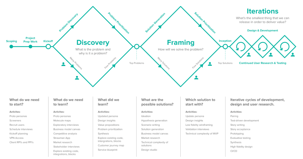 หลังจากนั้นก็จะเข้ากระบวนการหาวิธีเพื่อที่จะแก้ปัญหาจากสมมุติฐานต่างๆ ด้วยการสร้างต้นแบบ (prototype) และประเมินผล รวมถึงปรับปรุง prototype เพื่อให้มั่นใจว่าเป็นทางเลือกที่ดีที่สุดในการแก้ปัญหานั้นๆ จนออกมาเป็น MVP (Minimum Viable Product) เพื่อนำเข้าสู่การพัฒนา เป็นกระบวนการ Lean Methodology (WHAT) ที่จะได้ Product ที่ถูกต้องสำหรับปัญหานั้นๆ (build the right thing)
