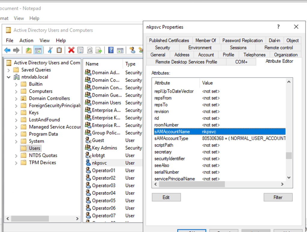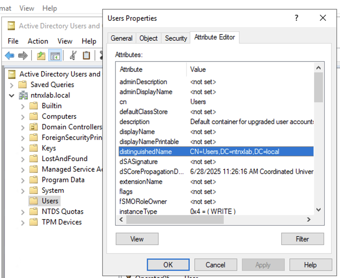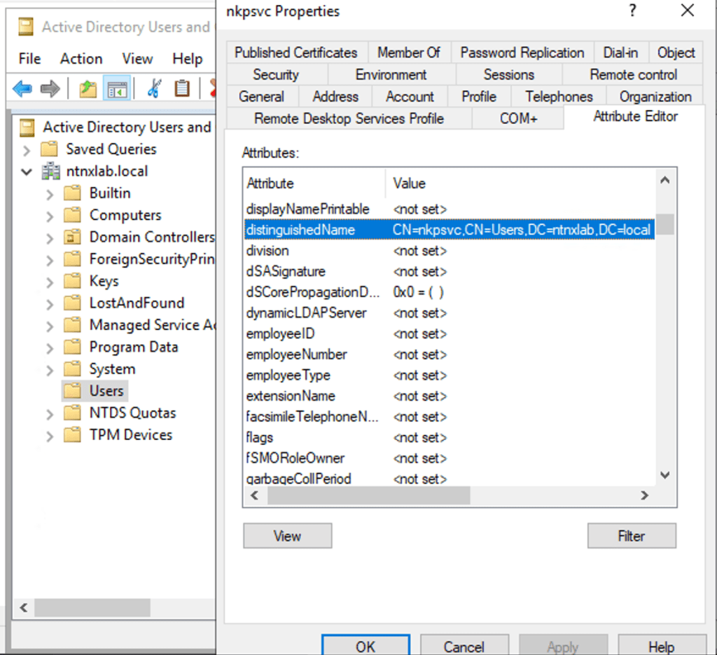 click เลือก Attribute Editor และ copy ค่า distinguishedName สำหรับใช้ในการ config ที่ nkp