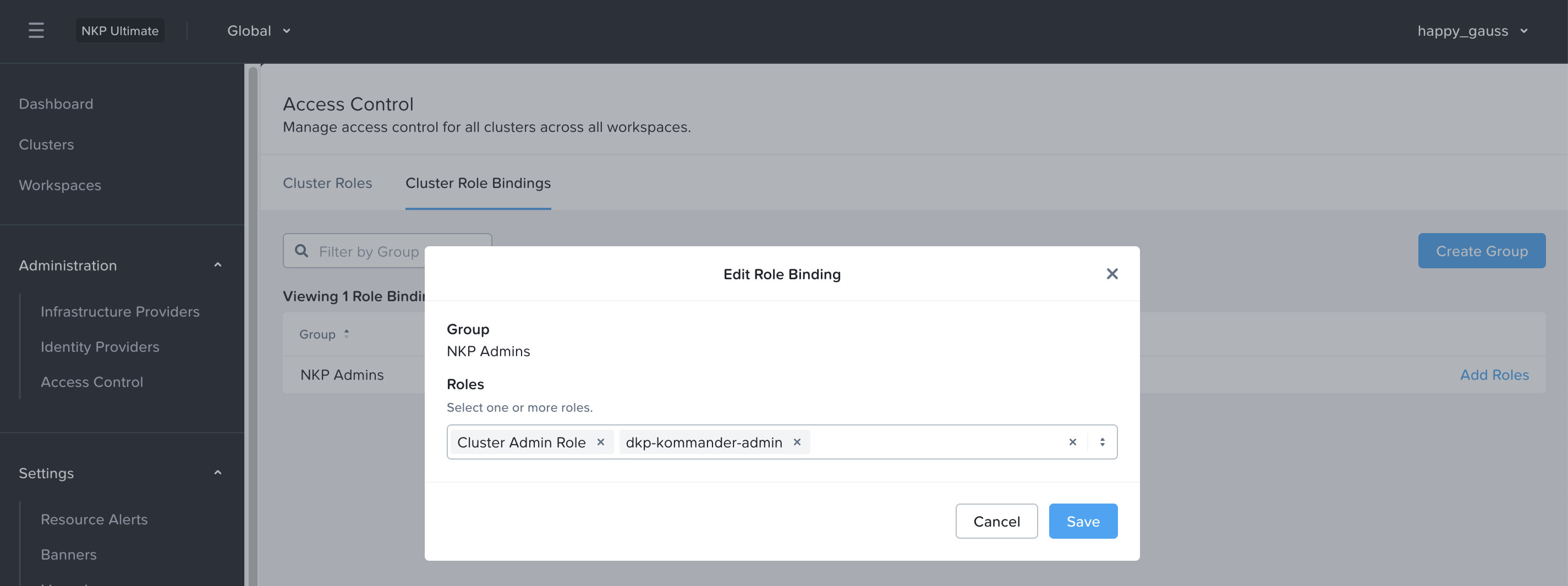 เลือก Cluster Role Bindings เลือก Add Roles ที่ group NKP Admins จากนั้น assign role Cluster Admin Role และ dkp-kommander-admin
