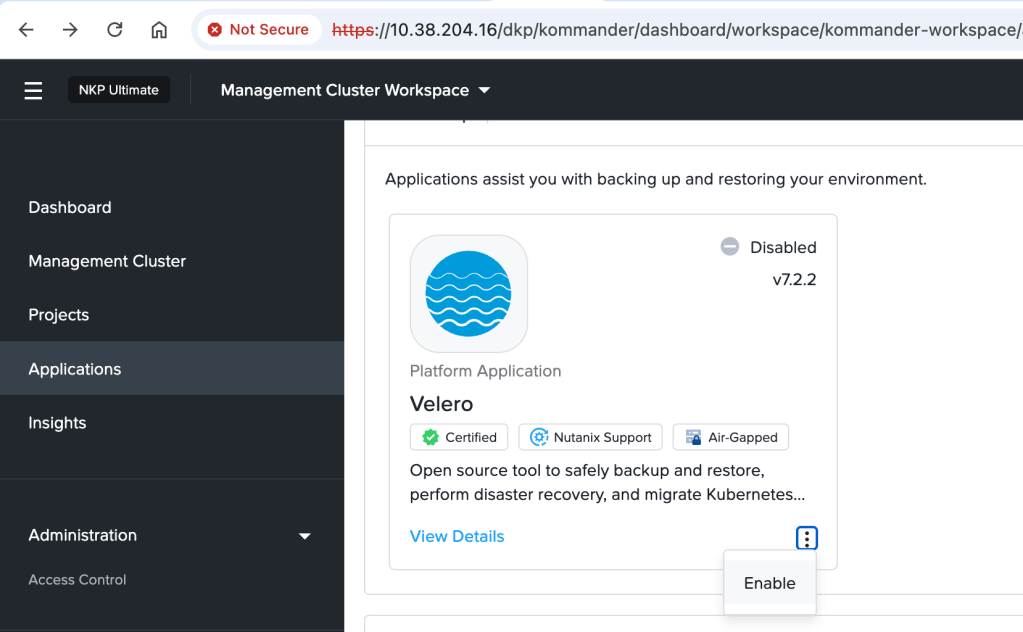 ทำการ enable velero ที่ nkp dashboard เนื่องจาก velero ต้องการ s3 storage เพื่อเก็บข้อมูล backup จึงต้อง enable rookceph และ rookceph cluster โดยจะต้องรอจนกว่าจะ running สมบูรณ์ก่อนจะ enable velero