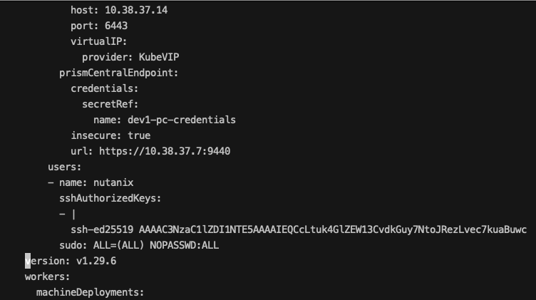 nkp create cluster nutanix --cluster-name dev1 \--namespace kommander-default-workspace \--endpoint https://10.38.37.7:9440 \--control-plane-prism-element-cluster PHX-POC265 \--control-plane-subnets primary-PHX-POC265 \--control-plane-replicas 1 \--control-plane-endpoint-ip 10.38.37.14 \--control-plane-vm-image nkp-rocky-9.4-release-1.29.6-20250609212843.qcow2 \--worker-subnets primary-PHX-POC265 \--worker-replicas=3 \--worker-vm-image nkp-rocky-9.4-release-1.29.6-20250609212843.qcow2 \--worker-prism-element-cluster PHX-POC265 \--csi-storage-container default \--kubernetes-service-load-balancer-ip-range 10.38.37.15-10.38.37.17 \--registry-mirror-url https://10.38.37.51/nkp2120 \--registry-mirror-username admin \--registry-mirror-password Harbor12345 \--registry-mirror-cacert /home/nutanix/harbor/certs/harbor.local.crt \--ssh-public-key-file /home/nutanix/id_ed25519.pub \--ssh-username nutanix \--airgapped \--insecure \--verbose 5 \--timeout 0 \--dry-run \--skip-preflight-checks=NutanixVMImageKubernetesVersion \--output=yaml > dev1-cluster.yaml