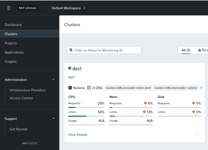 [nutanix@harbor ~]$ kubectl apply -f dev1-cluster.yamlsecret/dev1-pc-credentials createdsecret/dev1-pc-credentials-for-csi createdsecret/dev1-image-registry-mirror-credentials createdWarning: Cluster has skipped preflight check "NutanixVMImageKubernetesVersion"cluster.cluster.x-k8s.io/dev1 created